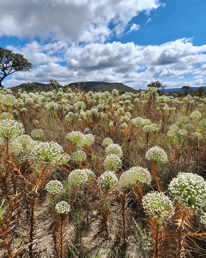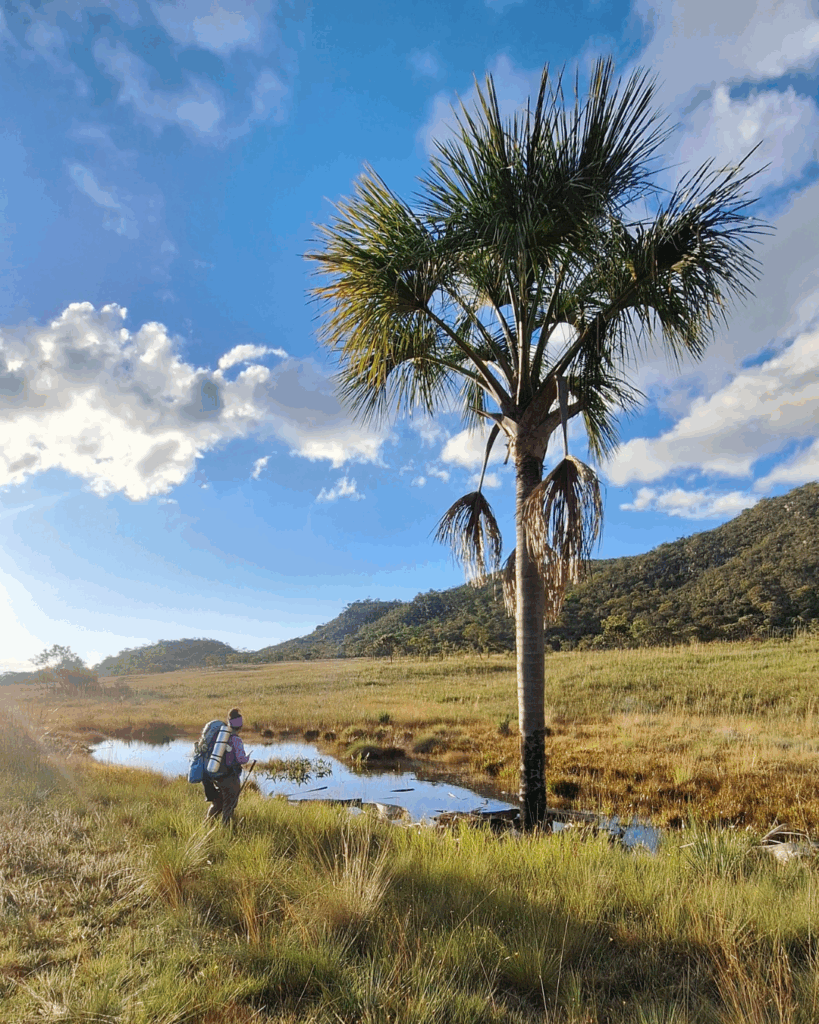Um cacho de sempre-vivas foram as primeiras flores que ganhei na vida. Eu era criança, e de vez em quando Papai fazia longas expedições de caça com os amigos; numa dessas, lá pelas bandas da Serra do Cabral, ele voltou trazendo um cacho de chuveirinho, a coisa mais linda que meus olhos de criança já tinham visto, e lembro com carinho de tê-la em casa durante muito tempo. Da mesma época – e talvez da vida inteira – lembro também das histórias das andanças dele pelo sertão, das aparições de pantumias, palavra que oficialmente nem existe, mas que no nosso contexto equivale a seres míticos, animais e homens de proporções descomunais, de luzes misteriosas. Já quase adulta fui obrigada a ler Guimarães Rosa; não gostei de imediato não, mas me rendi a dois aspectos. O primeiro: o linguajar – um livro que continha expressões pouco usuais, mas que me soavam familiares. O segundo: toda a minha região geográfica de origem está na obra, o que deu um ar de importância a uma infinidade de lugares pacatos que eu julgava irrelevantes. Mais tarde um pouco, quando me apaixonei pelo Cerrado e me reconheci cria dele, todos esses retalhos se juntaram numa coisa só e dizem muito sobre minhas paixões e identidade. Daí me dei conta de que dos cenários da obra de Guimarães e do Cerrado, uma delas eu só reconheci por foto e por imaginação: as Veredas. Veredas são os oásis do Cerrado; áreas alagadas, com vegetação diferente do entorno, marcada pela presença de palmeiras Buritis. Grande parte das águas que formam as Veredas vem do lençol freático, o que mesmo em tempo de seca garante um ambiente seguro onde inúmeras espécies de animais vêm para se alimentar e reproduzir. Veredas são lugares de vida, e que eu desejava muito conhecer. Em maio do ano passado (2024), durante uma trilha com amigos, compartilhei com Ernani sobre o sonho de conhecê-las; os olhos dele brilharam na hora, e visivelmente emocionado ele me contou sobre um encontro com um personagem que eu entendi como um guardião das Veredas. Fiquei feliz com essa conexão, mas nunca mais falamos no assunto, até que no início desse ano a Borandá propôs uma travessia que incluiria esse cenário. O roteiro me encheu os olhos: partiríamos de Curimataí, cruzando parte do Parque Nacional das Sempre-Vivas e saindo pela vila de Santa Bárbara, distrito de Augusto de Lima, bem no centro do estado de Minas. Uma caminhada difícil e longa, carregando peso e sob o Sol forte do Espinhaço. Mas eu não seria doida de não viver essa aventura, e foi assim que o sonho começou a tomar forma.