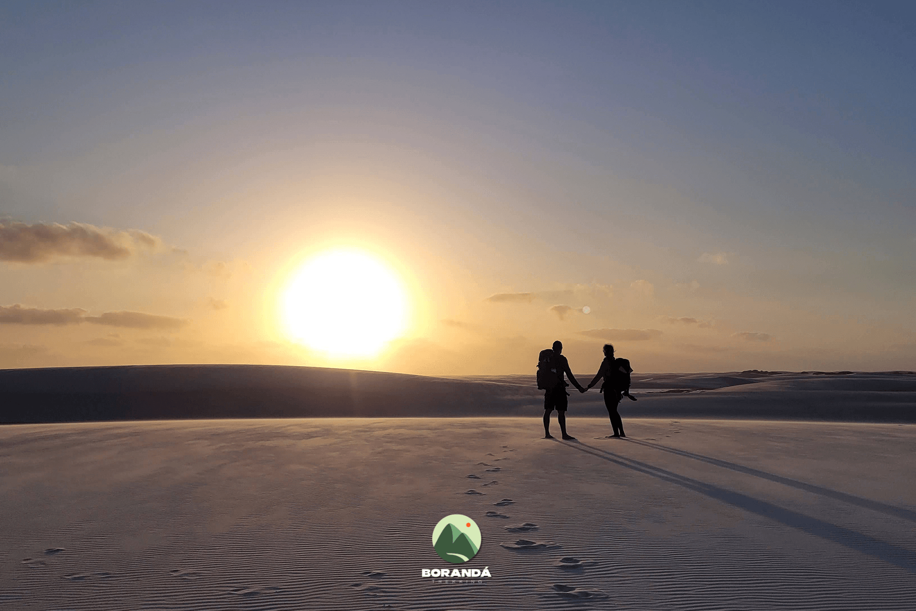 O último dia da travessia começa cedo, com café da manhã servido às 06h00, enquanto o sol desponta sobre as dunas. Às 07h00, iniciamos a caminhada rumo a Santo Amaro, percorrendo cerca de 9 km por entre lagoas e campos de areia branca, com paradas refrescantes para banho em águas cristalinas — uma despedida perfeita dos Lençóis Maranhenses.